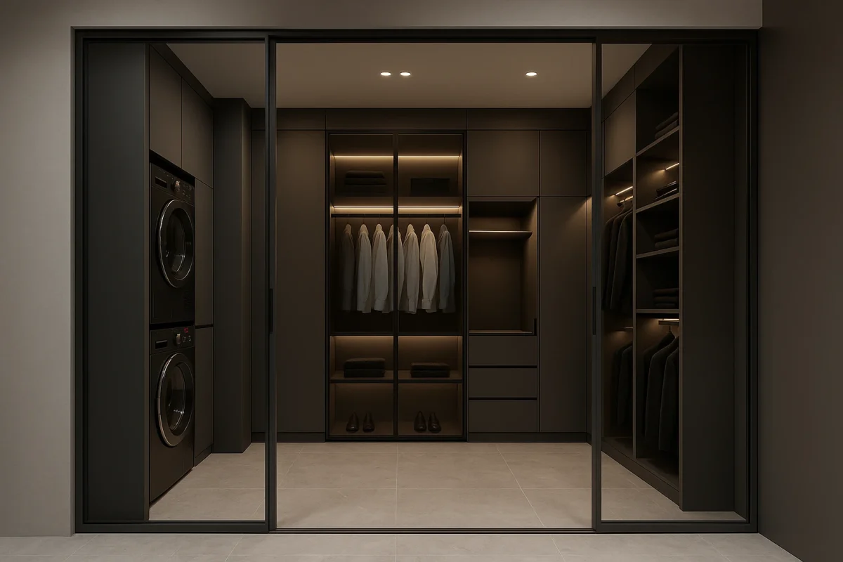 Можно ли ставить сушильную над стиральной? Да, но через фирменный комплект и при достаточной глубине ниши (обычно 65–70 см). Что лучше: конденсационная или тепловой насос? Тепловой насос экономичнее и бережнее к тканям, меньше нагревает воздух в шкафу. Сколько места нужно минимум? Для одной машины — ниша 60×60 см; для колонки — ширина 60 см, глубина 65–70 см, высота 190–200 см. Будет ли слышно в студии? Да, но можно снизить шум выбором тихих моделей, демпферами и закрытыми фасадами.14) Чек-лист дизайнеру и заказчику перед стартом проекта