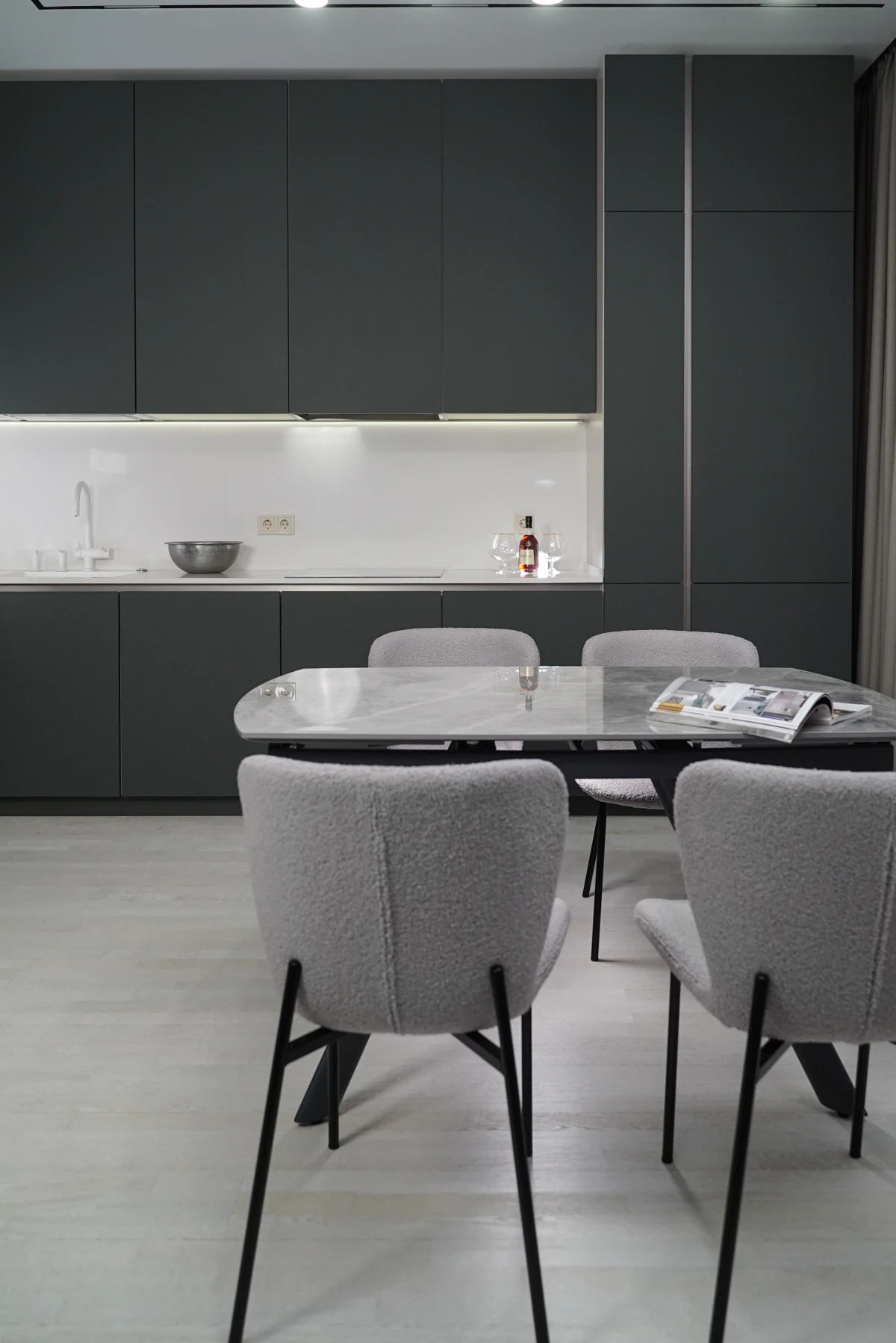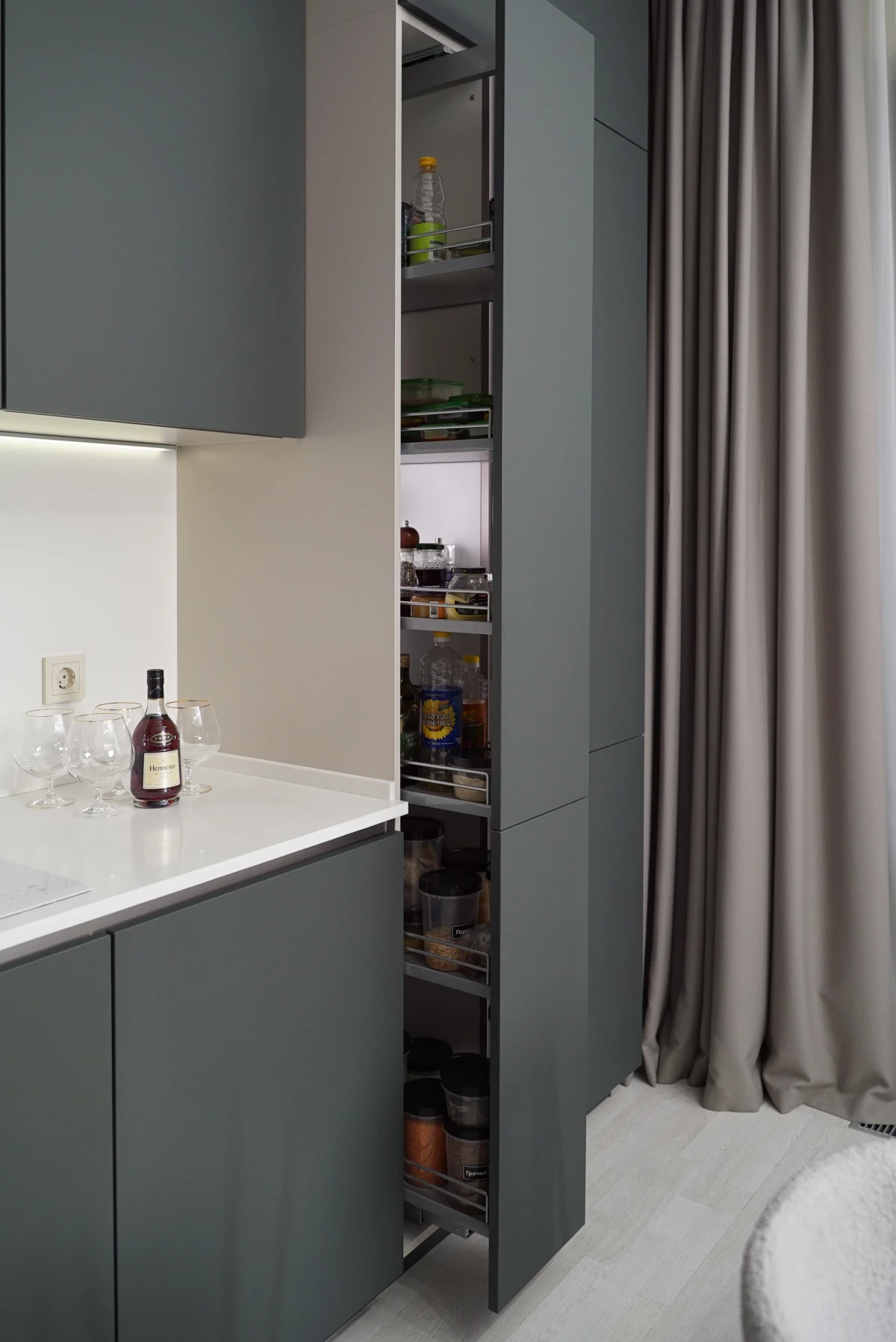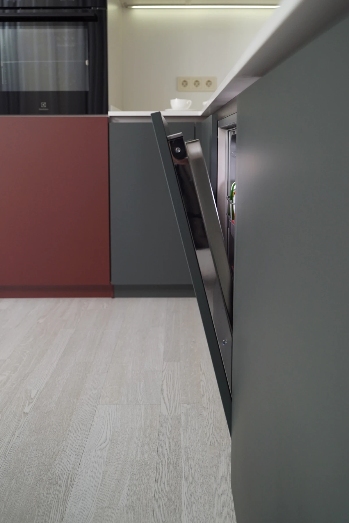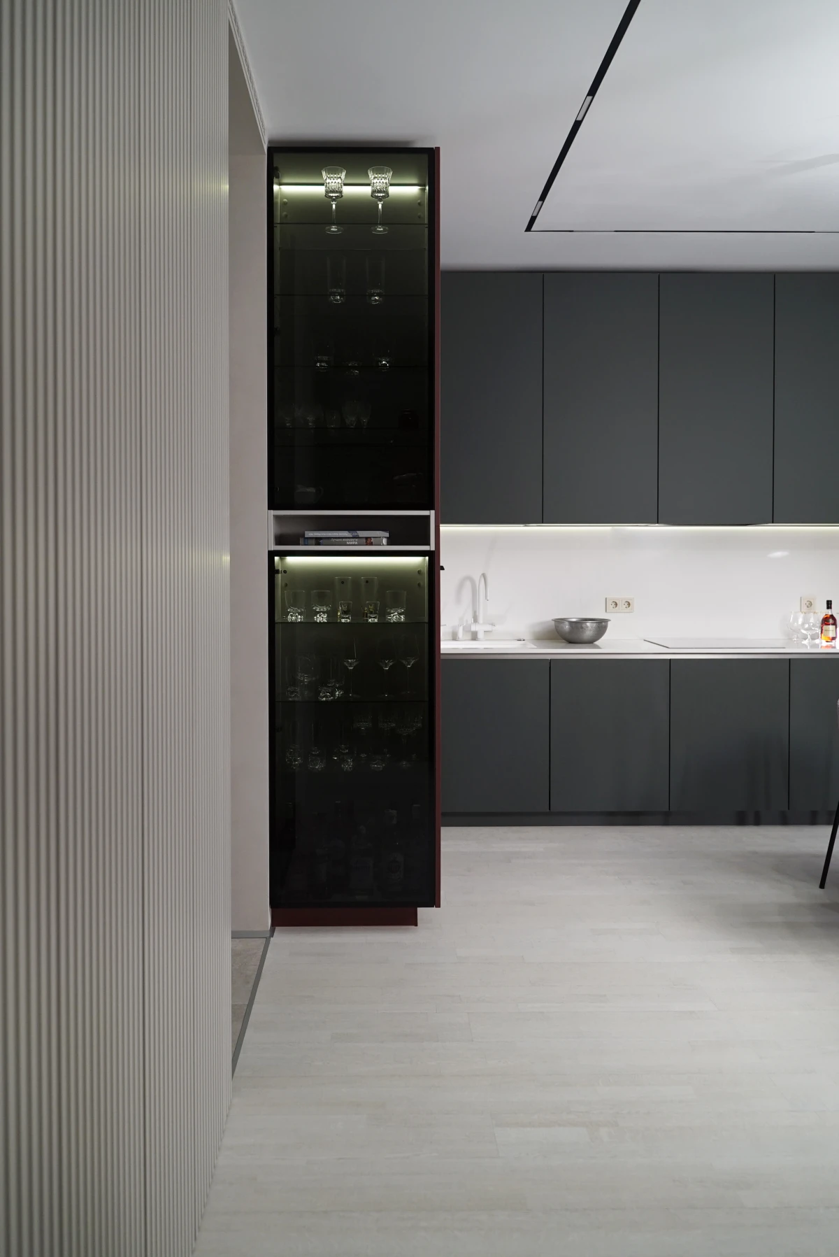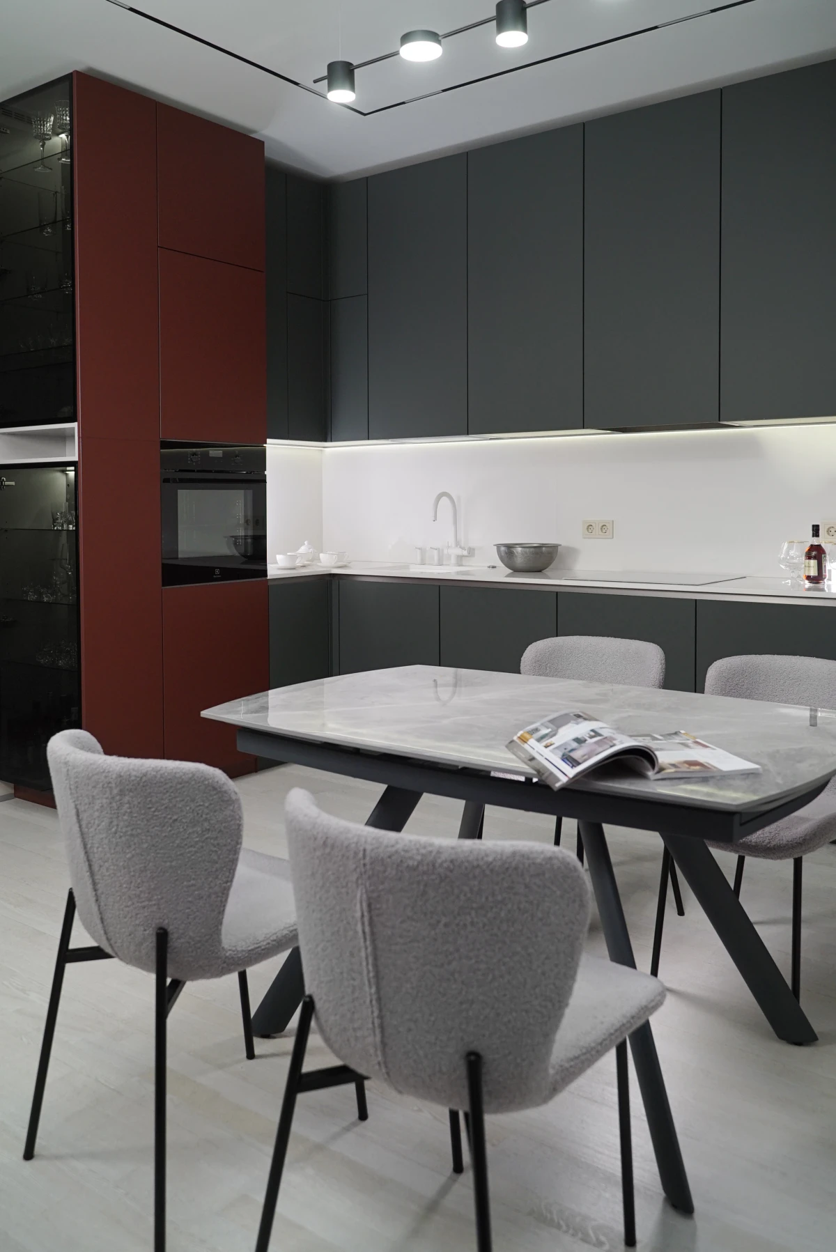 Концептуальная кухня, с фасадами без ручек. В основе дизайна всей квартиры лежит сочетание винного и темно зеленого цвета. Авторский дизайн проект разработан совместно с Анной Моревой, Interio Amore и отмечен номинацией 100 лучших дизайн проектов по версии журнала «Красивые дома».