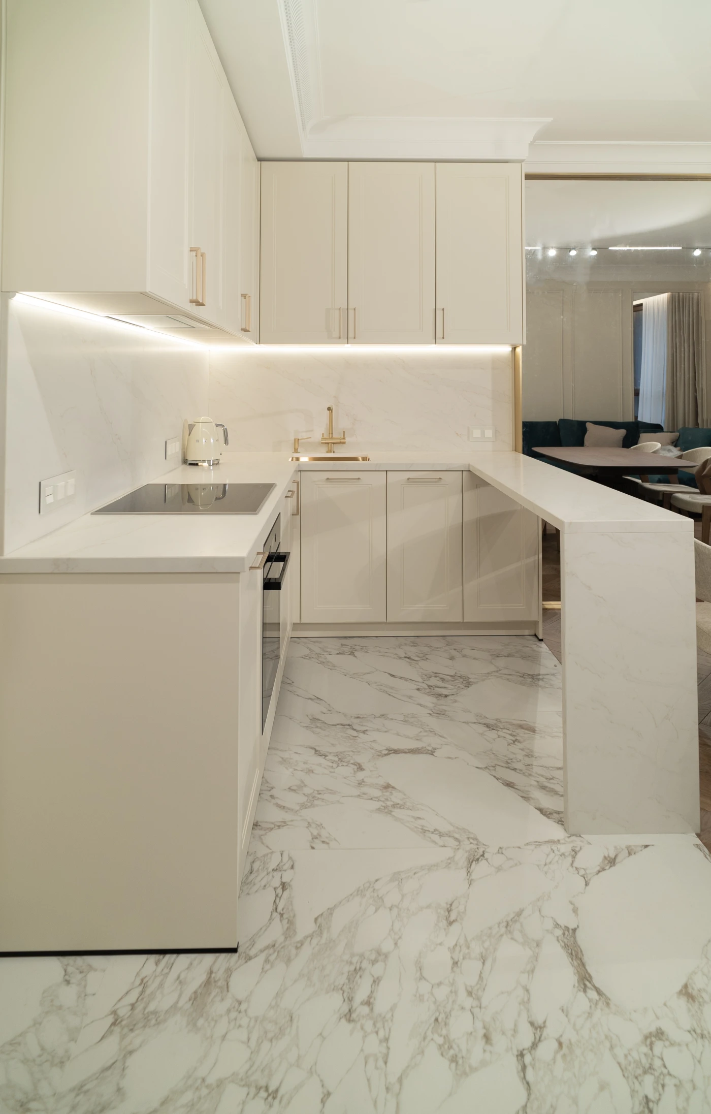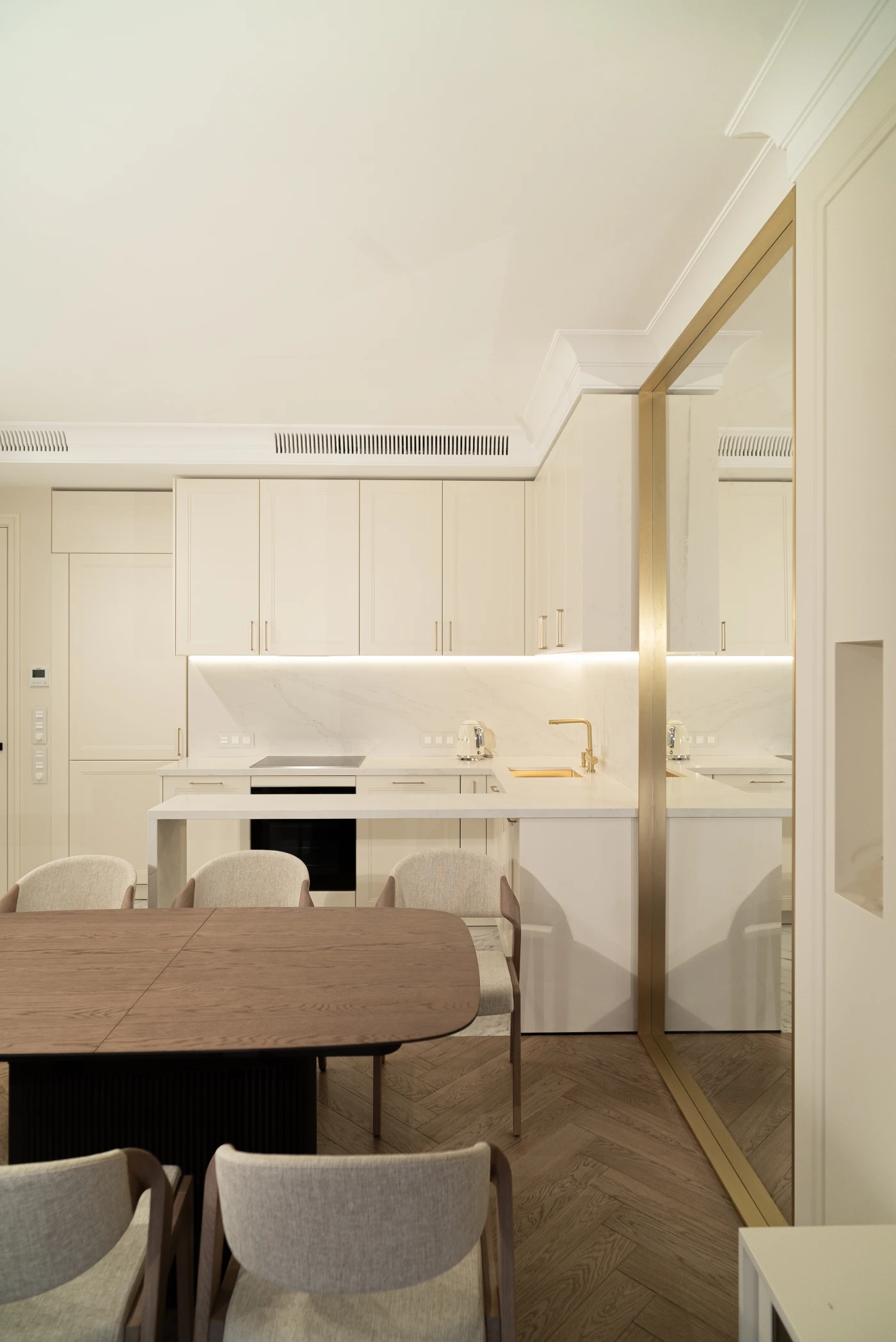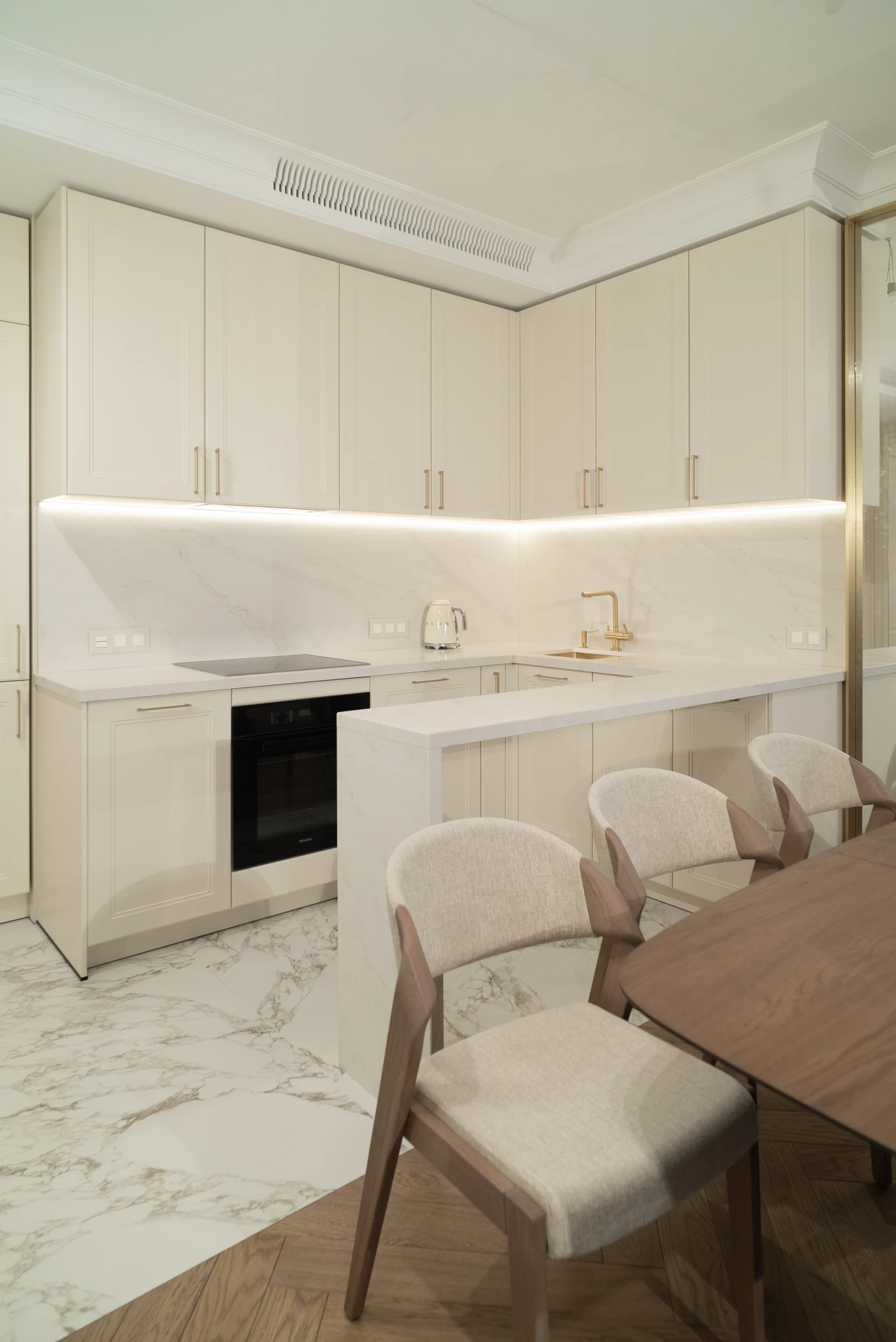Кухня в классическом стиле, теплого белого цвета с рамочными фасадами. Элегантные рифленные золотые ручки поддержаны смесителем и мойкой. Барная стойка зонирует пространство между кухней и обеденной зоной.