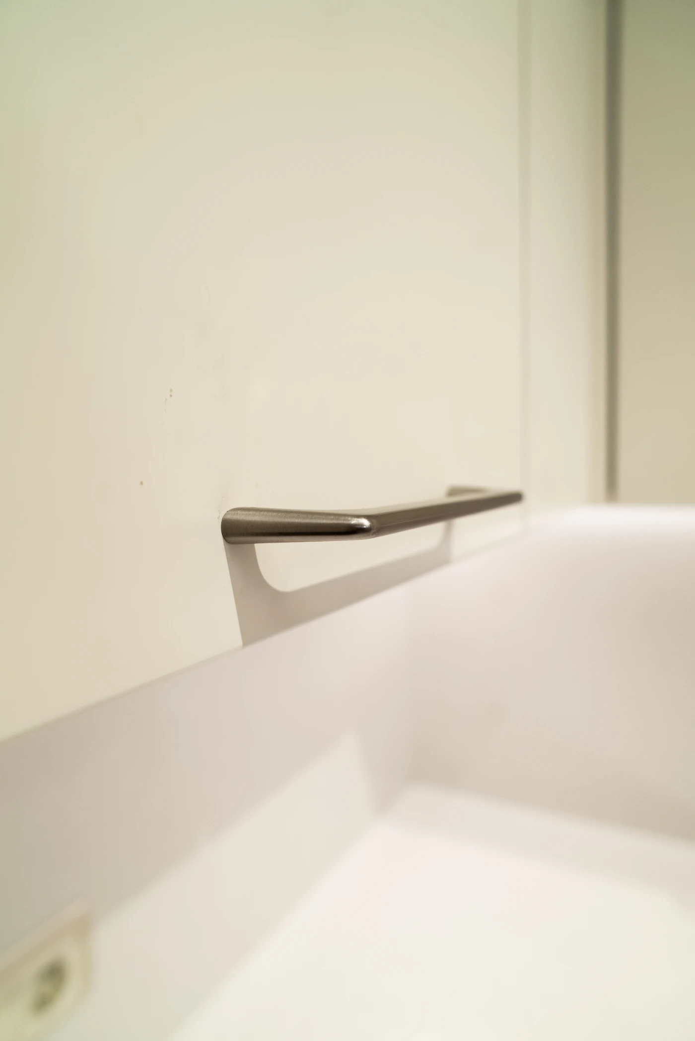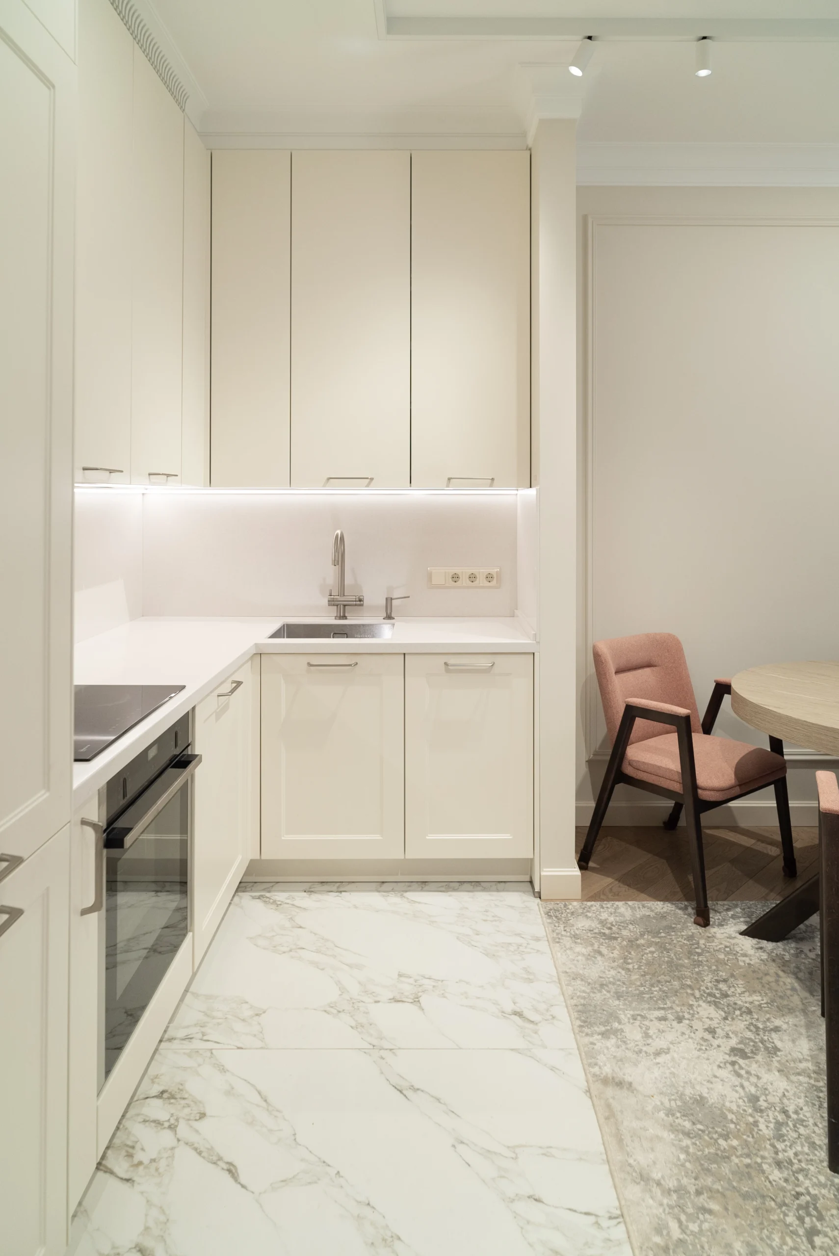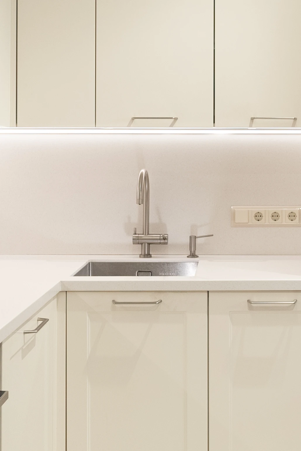 Классическая угловая кухня в потолок с двумя видами фасадов. Нижние базы и колонны выполнены с фасадами с изящной филенкой теплого белого оттенка магнолия. Высокие навесные шкафы исполнены в прямом варианте в потолок. Металические лаконичные ручки гармонируют со смесителем, дозатором для моющих средств, встроенным в кварцевую столешницу и мойкой подстольного монтажа.