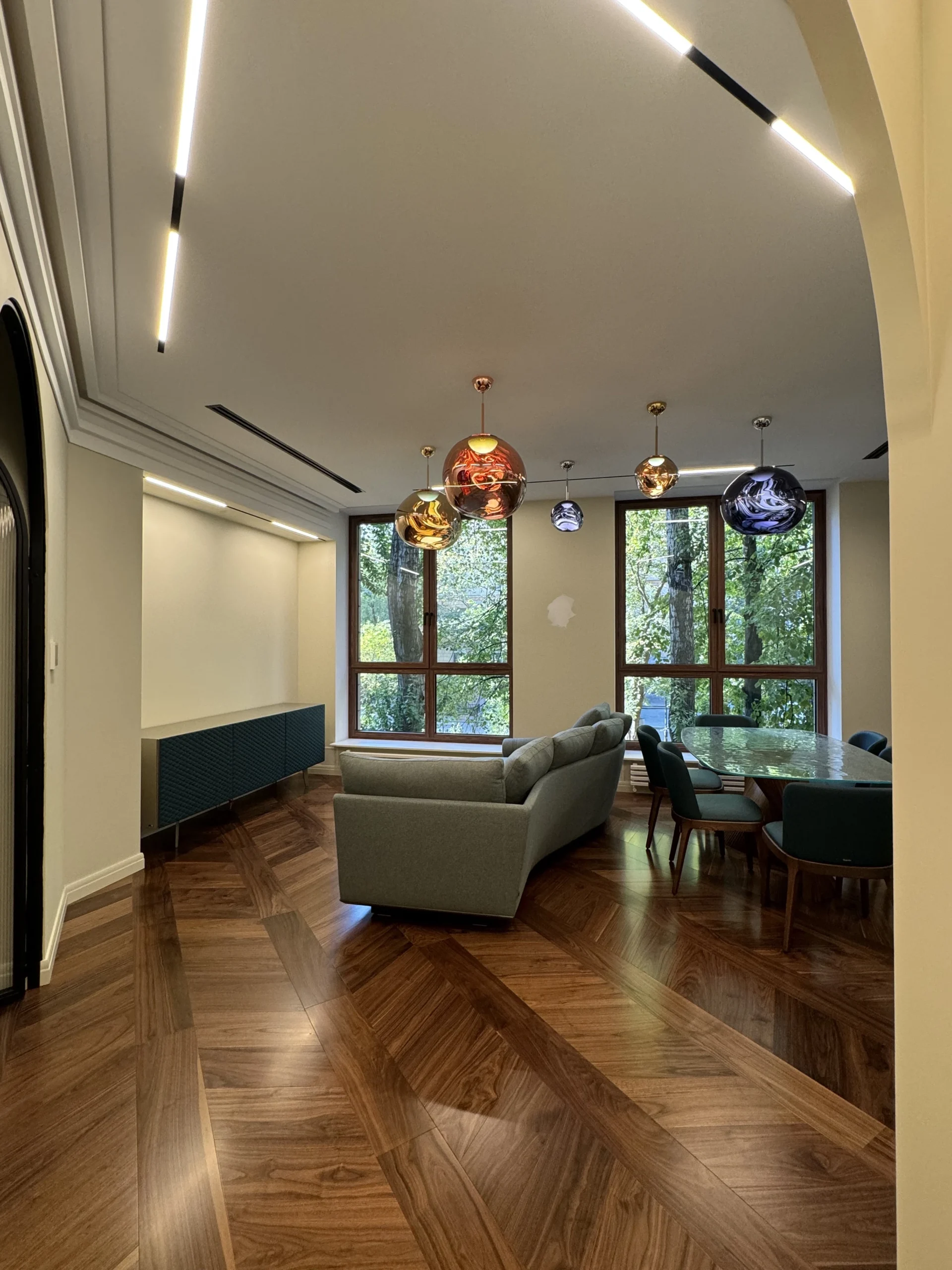 Стильный реализованный проект кухни-гостиной немецкой кухни фабрики Leicht. Кухня в стиле минимализм в цвете антрацит выполнена c фасадами из стекла и вставками шпона ореха. Кухня без ручек, верхние секции открываются по системе Push to open, нижние имеют встроенный профиль. Столешница и фартук выполнены из керамики.