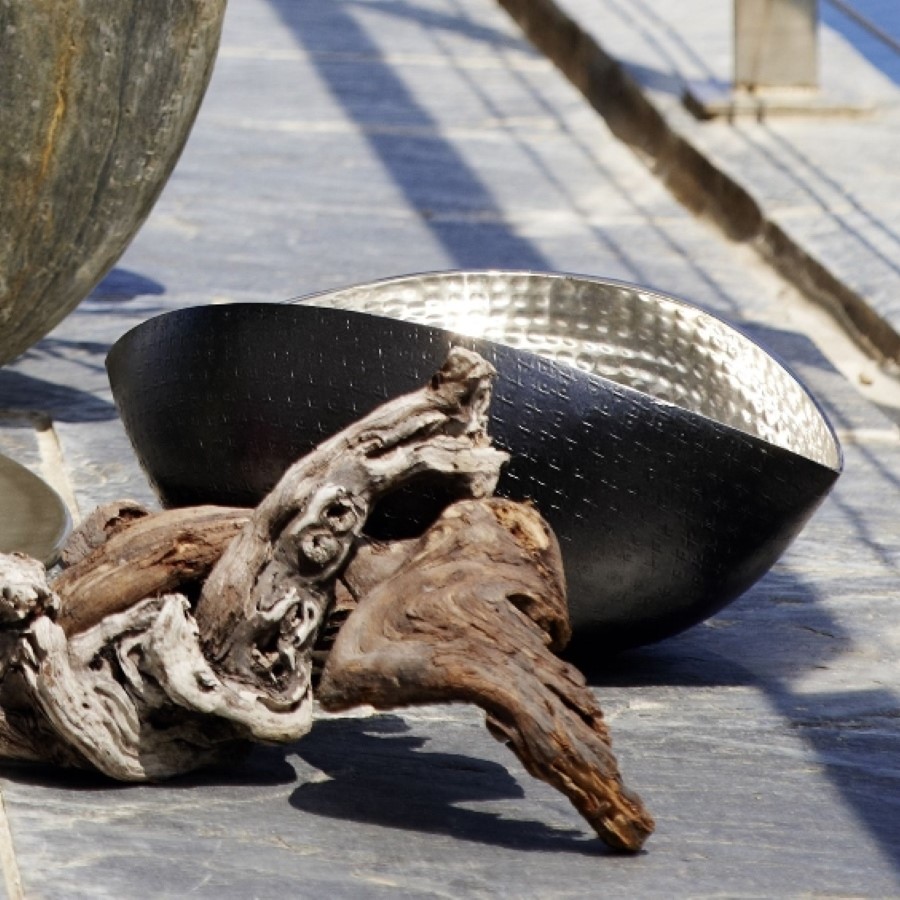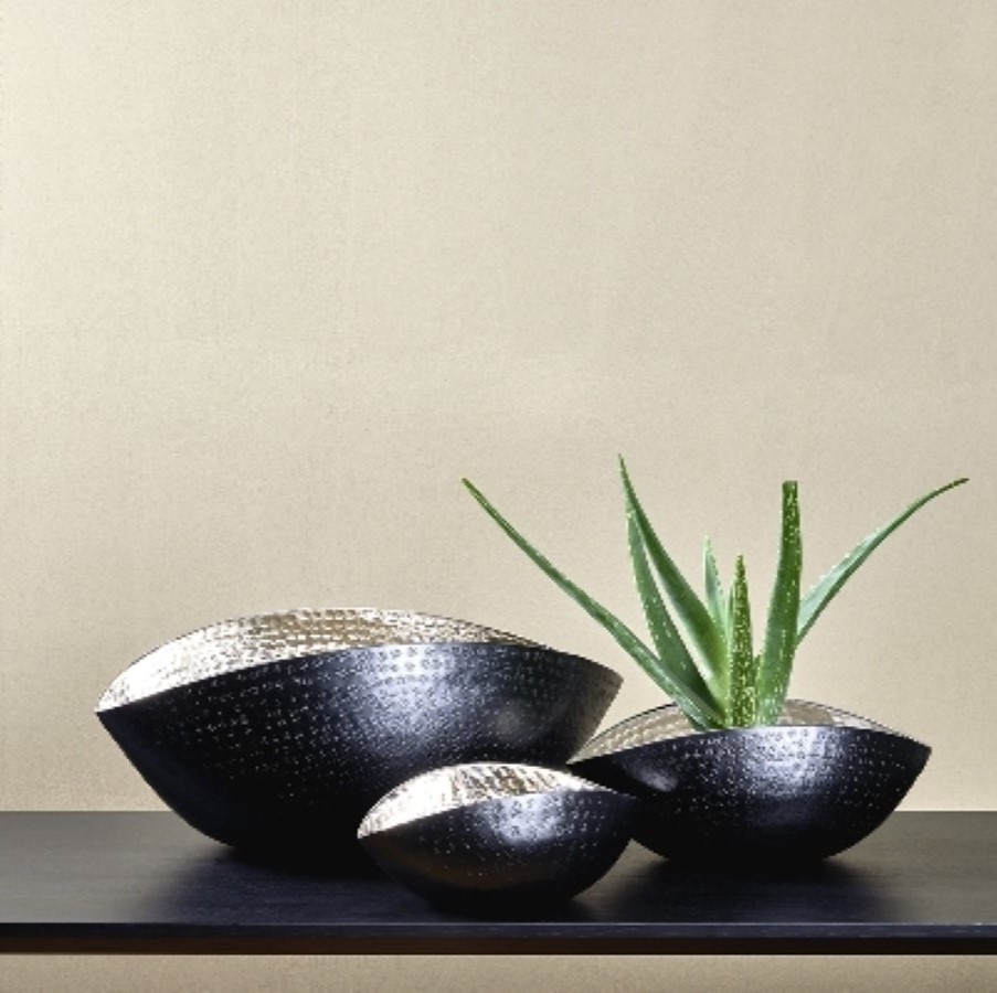 Оригинальные вазы для фруктов, кондитерских изделий, дизайнерские кашпо для цветов и декоративных композиций или подставка для свечей? Выбор за вами. Никелированный алюминий, вручную обработанный в технике чеканки, красиво бликует на свету. Внешняя часть ваз окрашена черным матовым лаком с эффектом патины. В серии вазы двух размеров. Премиум аксессуары немецкой марки Lambert — стильное украшение для дома и небанальный дизайнерский подарок по любому случаю. Предзаказ на июнь 2025 года.