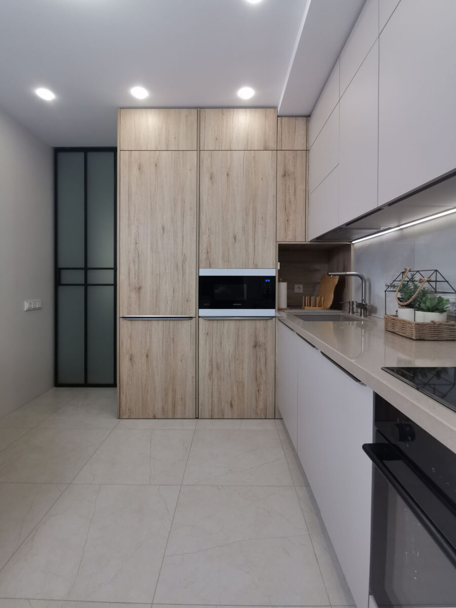 Современная кухня с индивидуальной планировкой от дизайнеров бренда Burger. Фасады премиум-качества с фактурой дерева разных теплых оттенков. Четкие линии, приятная цветовая гамма и функциональное наполнение.