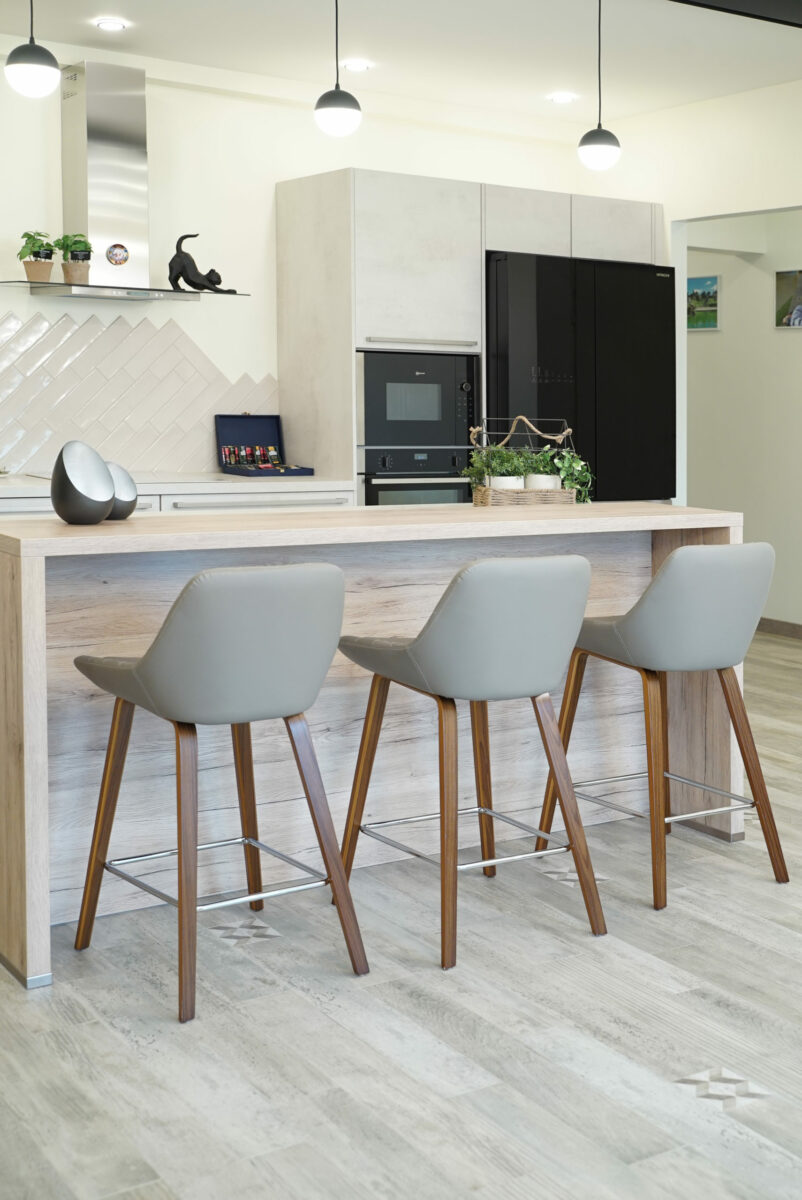 Новинка 2021 года! Модная кухня П-образной формы с открытыми полками и островом. Фасады с фактурой и оптикой бетона, цвет Terra. Доступно как с накладной ручкой, так и без ручки.