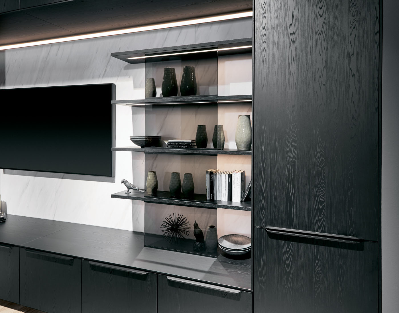 Эффектная, колоритная ТВ-зона для современной гостиной с артистичным характером. Настенные пеналы и шкафы Structura глубокого черного цвета с выразительным рельефным древесным рисунком натурального дуба дополняет яркий акцент – подвесная тумба с прямыми фасадами сложного винного цвета Easytouch. Текстура черного дуба также удачно смотрится с фасадами Senso, Touch, Easytouch в необычных оттенках: коралловый, нежный нефрит, аква, минеральный зеленый, небесно-голубой и т.д. Тонкие торцевые и накладные ручки черного матового цвета подчеркивают изысканную эстетику композиции.