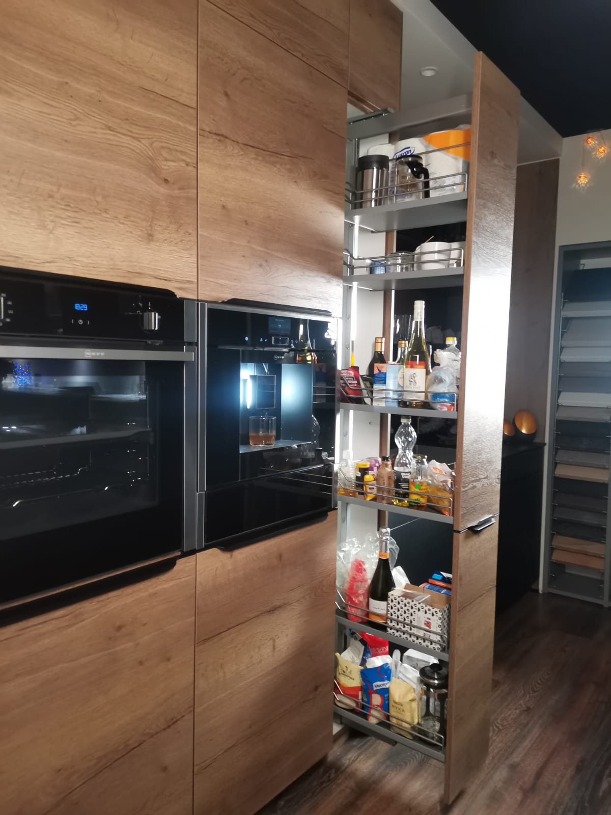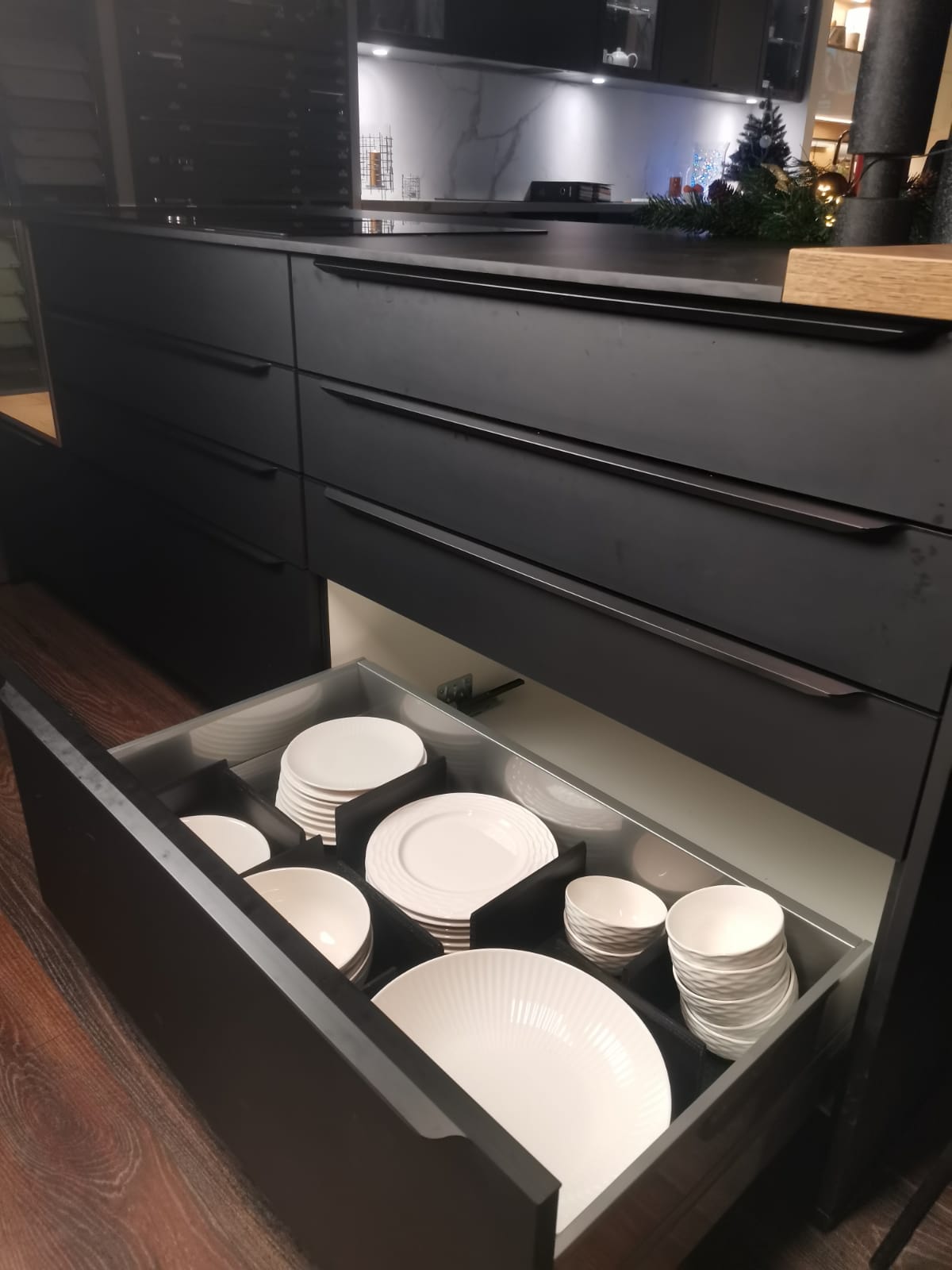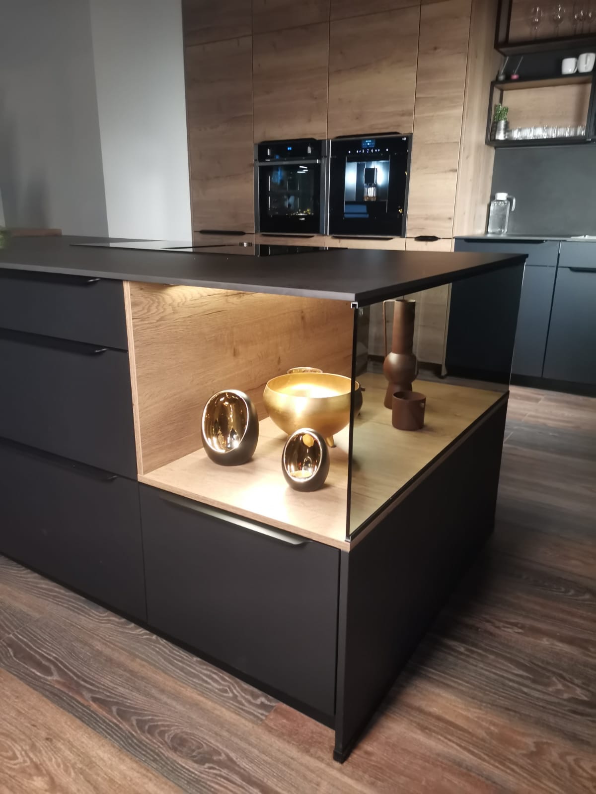 Большая кухня c островом и тонкой столешницей из керамики Laminam (Испания). Производитель: nobilia, Германия. 4000 мм (3980), остров – 2198 мм + барная стойка 1200 мм. Черные суперматовые HPL-фасады Easytouch с эффектом anti fingerprint, фасады с глубоким рельефным древесным рисунком Riva Дуб Havanna. Элегантные черные торцевые ручки на ширину фасада. В комплект входит: высокий аптекарский шкаф, шкаф с выдвижным фасадом и 2 внутренними ящиками, 16 выдвижных ящиков, столешница и стеновая панель – керамика Laminam, лоток для столовых приборов, натуральное дерево, встроенный в ящик органайзер для посуды, выдвижная система с ведром для мусора и секциями для бытовой химии, навесные боксы из черного металла, регулируемая LED-подсветка, противоскользящие коврики. В стоимость входит доставка по Москве и монтаж кухни. Возможен дозаказ колонн за отдельную плату. В указанную стоимость не входит бытовая техника, мойка и смеситель. Цены — по запросу. Подробная схема с размерами.