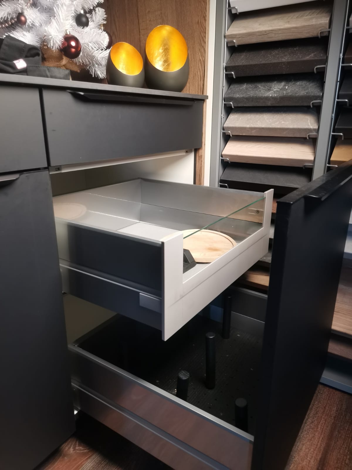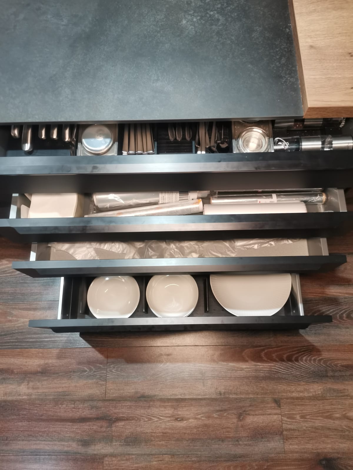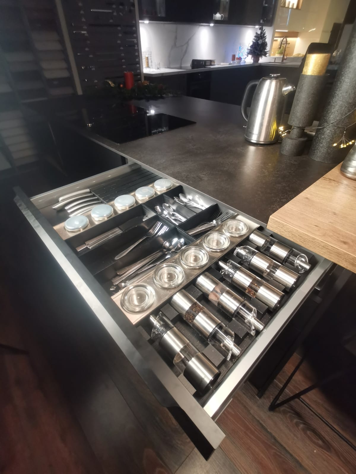 Большая кухня c островом и тонкой столешницей из керамики Laminam (Испания). Производитель: nobilia, Германия. 4000 мм (3980), остров – 2198 мм + барная стойка 1200 мм. Черные суперматовые HPL-фасады Easytouch с эффектом anti fingerprint, фасады с глубоким рельефным древесным рисунком Riva Дуб Havanna. Элегантные черные торцевые ручки на ширину фасада. В комплект входит: высокий аптекарский шкаф, шкаф с выдвижным фасадом и 2 внутренними ящиками, 16 выдвижных ящиков, столешница и стеновая панель – керамика Laminam, лоток для столовых приборов, натуральное дерево, встроенный в ящик органайзер для посуды, выдвижная система с ведром для мусора и секциями для бытовой химии, навесные боксы из черного металла, регулируемая LED-подсветка, противоскользящие коврики. В стоимость входит доставка по Москве и монтаж кухни. Возможен дозаказ колонн за отдельную плату. В указанную стоимость не входит бытовая техника, мойка и смеситель. Цены — по запросу. Подробная схема с размерами.