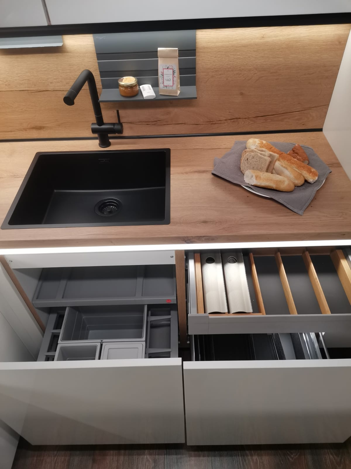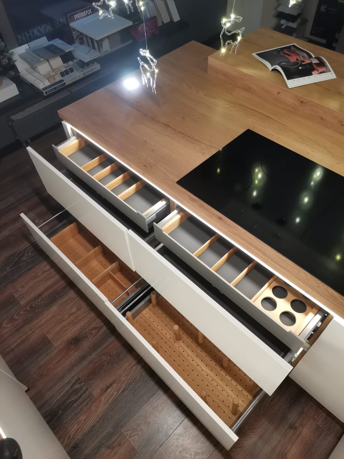В связи со сменой экспозиции успейте купить выставочный образец! П-образная кухня без ручек Flash с полуостровом и барной стойкой, размеры: 307 х 265 х 255 см. Белые глянцевые фасады. Профильная ручка Gola. Открытые ниши, столешница, барная стойка 10 см – светлый дуб San Remo. Премиум-комплектация: 2 угловых элемента с поворотно-выдвижным механизмом, колонна на 2 прибора техники, колонна со встроенной посудомоечной машиной, 9 выдвижных ящиков, навесной шкаф со складной дверцей и сушкой для посуды, 2 лотка для столовых приборов и 2 органайзера для посуды, массив дуба, открытый стеллаж с полками и ящиком для пряной зелени с установкой на столешницу, стеновая панель и релинг с полкой и подсветкой, LED-подсветка столешницы, профильной ручки, ниш и стеллажа с разбивкой по зонам, регулировкой интенсивности и температуры света, противоскользящие коврики во всех ящиках.